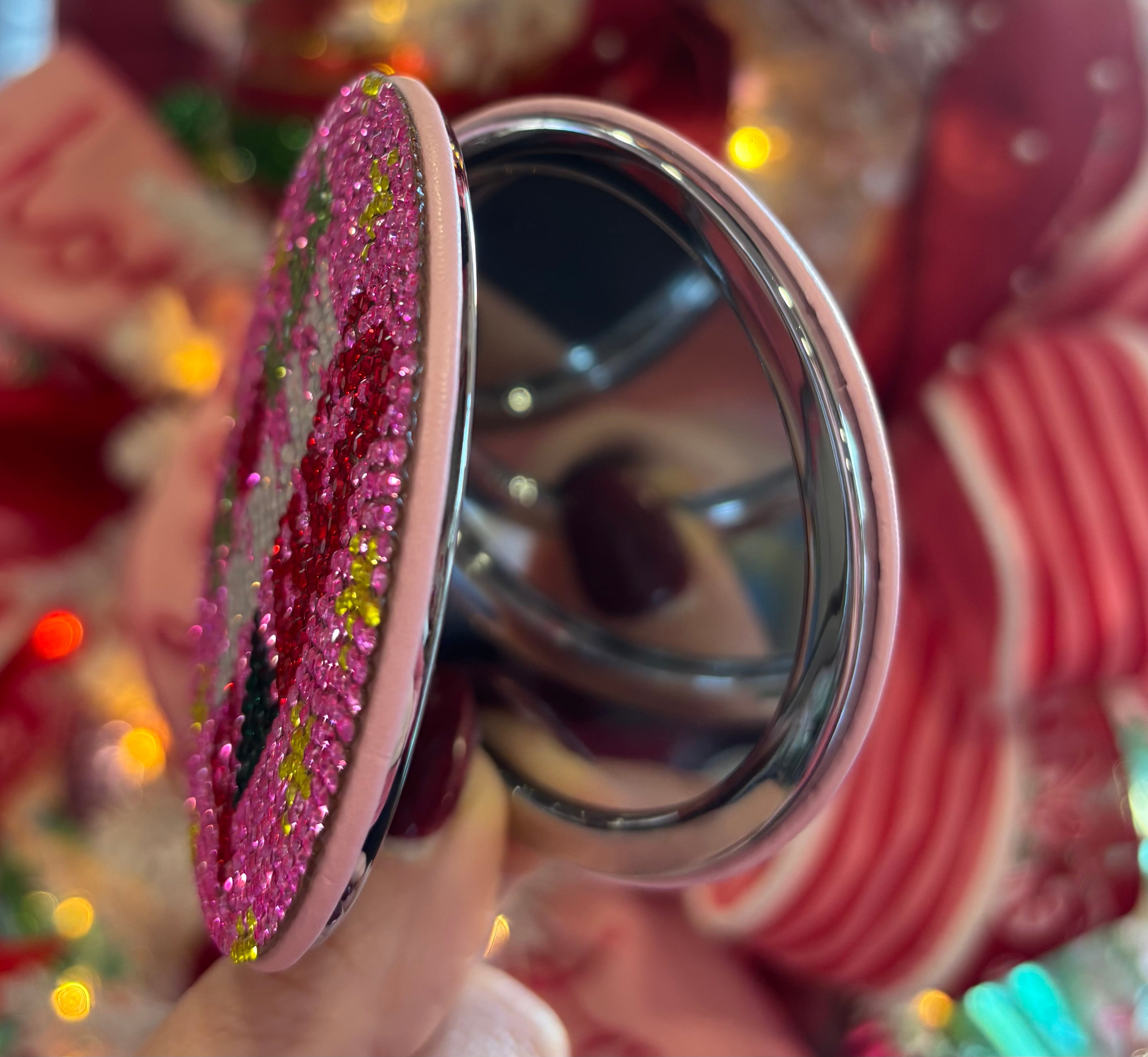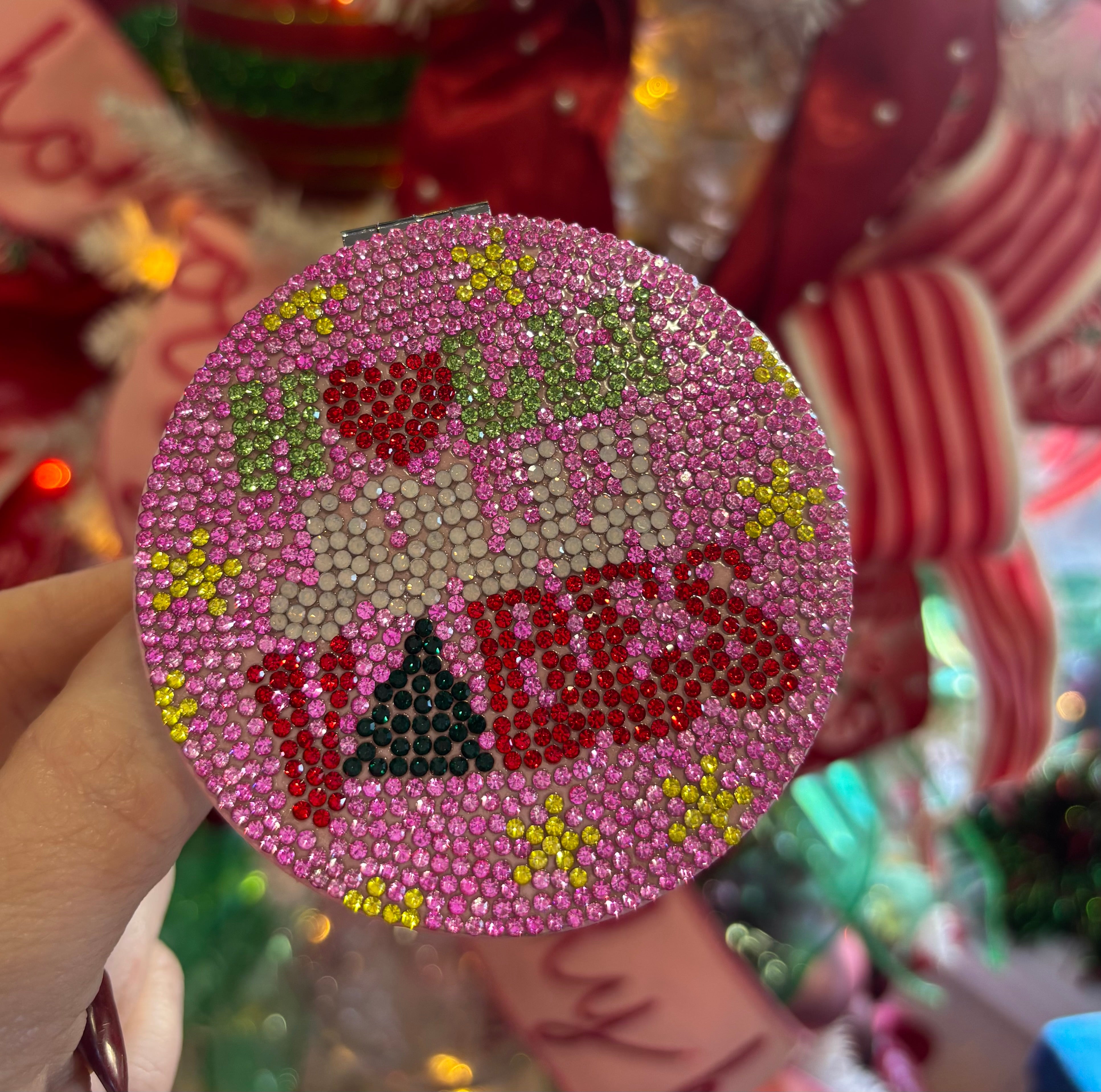 Sparkle wherever you go with this Holly Jolly Compact Mirror—the perfect pocket-sized accessory for touch-ups on the move. Featuring eye-catching bling details that catch the light beautifully, it's both functional and fabulous. Keep your glow game strong all day long.