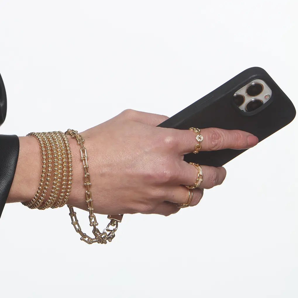 With 4 Chain styles to choose from, Maya J's Phone Wristlets offer the perfect combination of functionality and style, making them an essential accessory for retailers looking to captivate modern consumers. These 14K gold-plated wristlets transform any phone into a wearable, fashion-forward piece, designed for convenience and elegance. Easy to attach, the chain wristlets fit most phone cases without blocking the charging port, ensuring practicality for women on the go.
