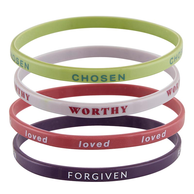 This set features bracelets which read: "Chosen", "Worthy", "Loved" and "Forgiven", reminds of who God says we are. Comes on a backer card for easy display.
