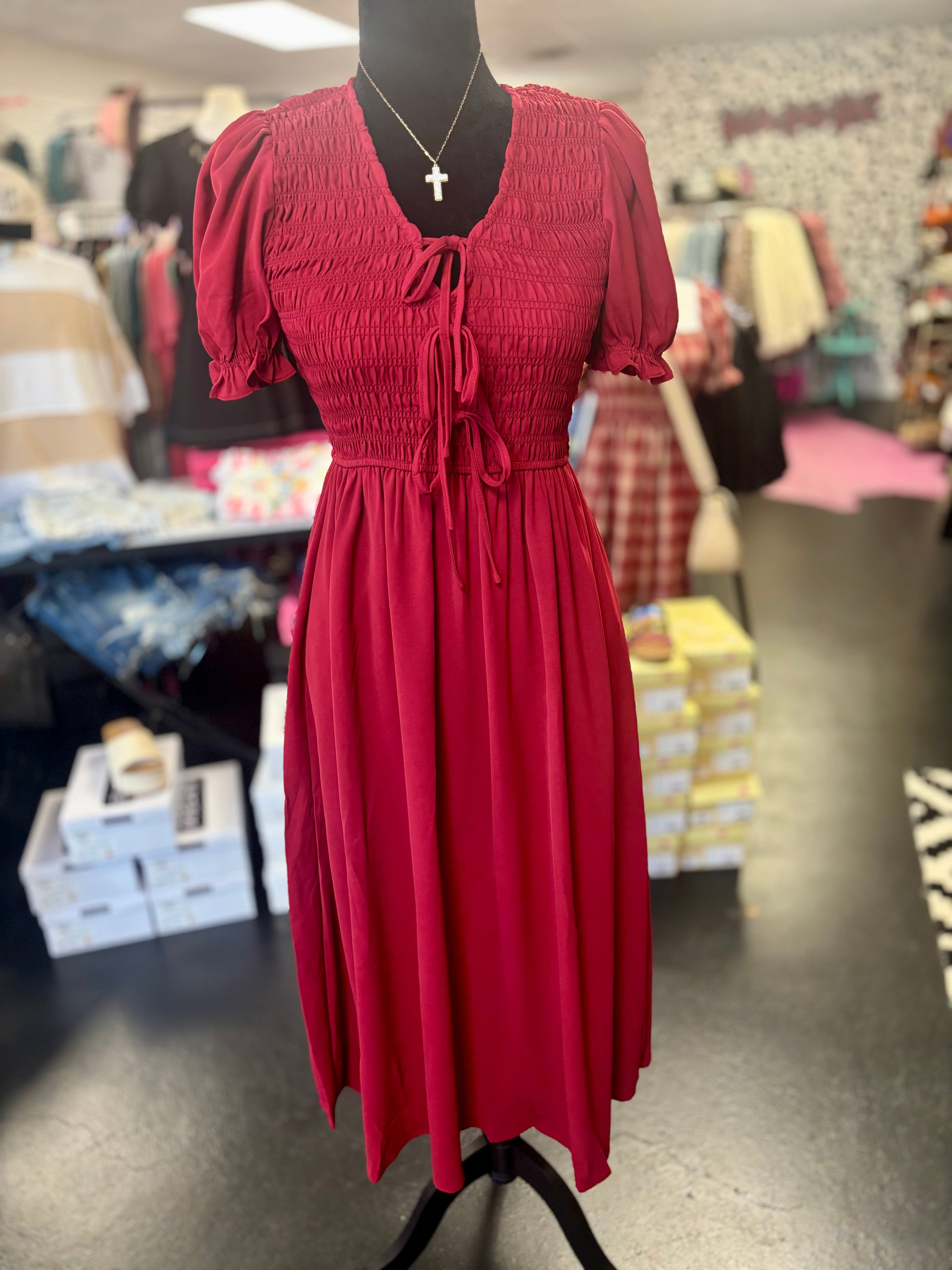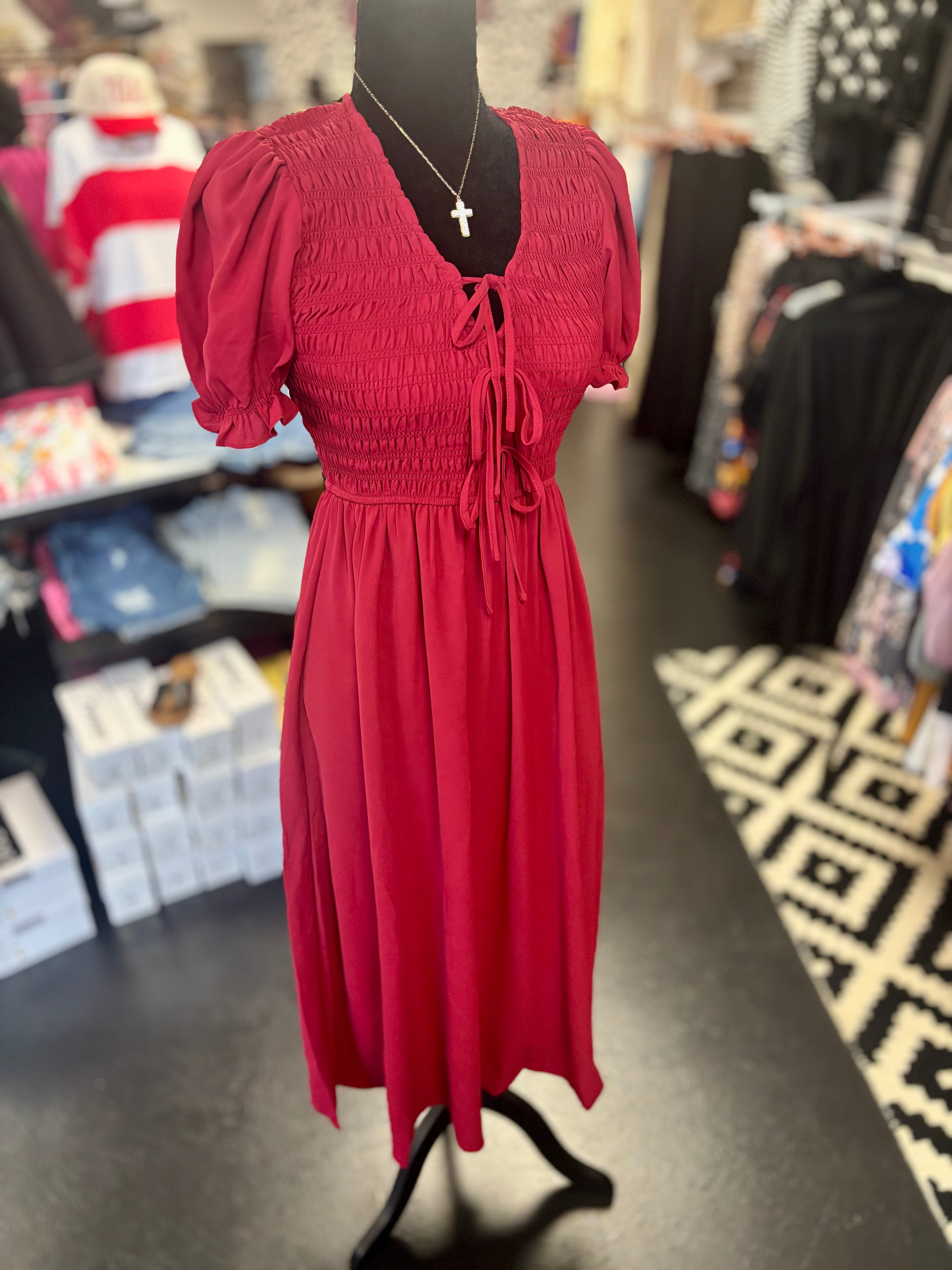 Deep Red Bow Midi Smocked Dress - is backordered and will ship as soon as it is back in stock.