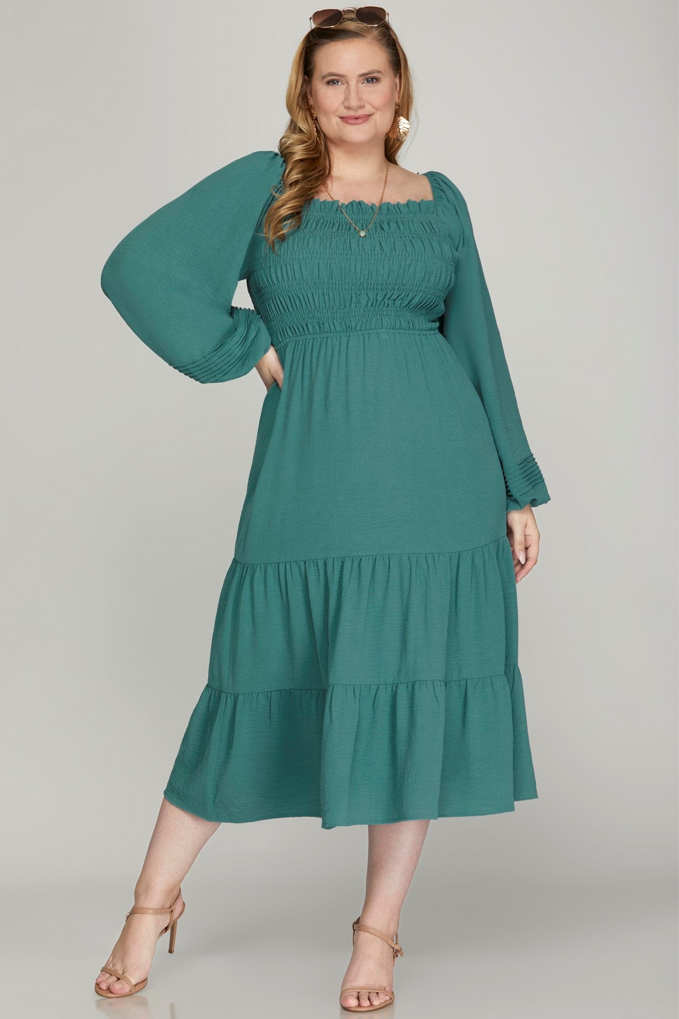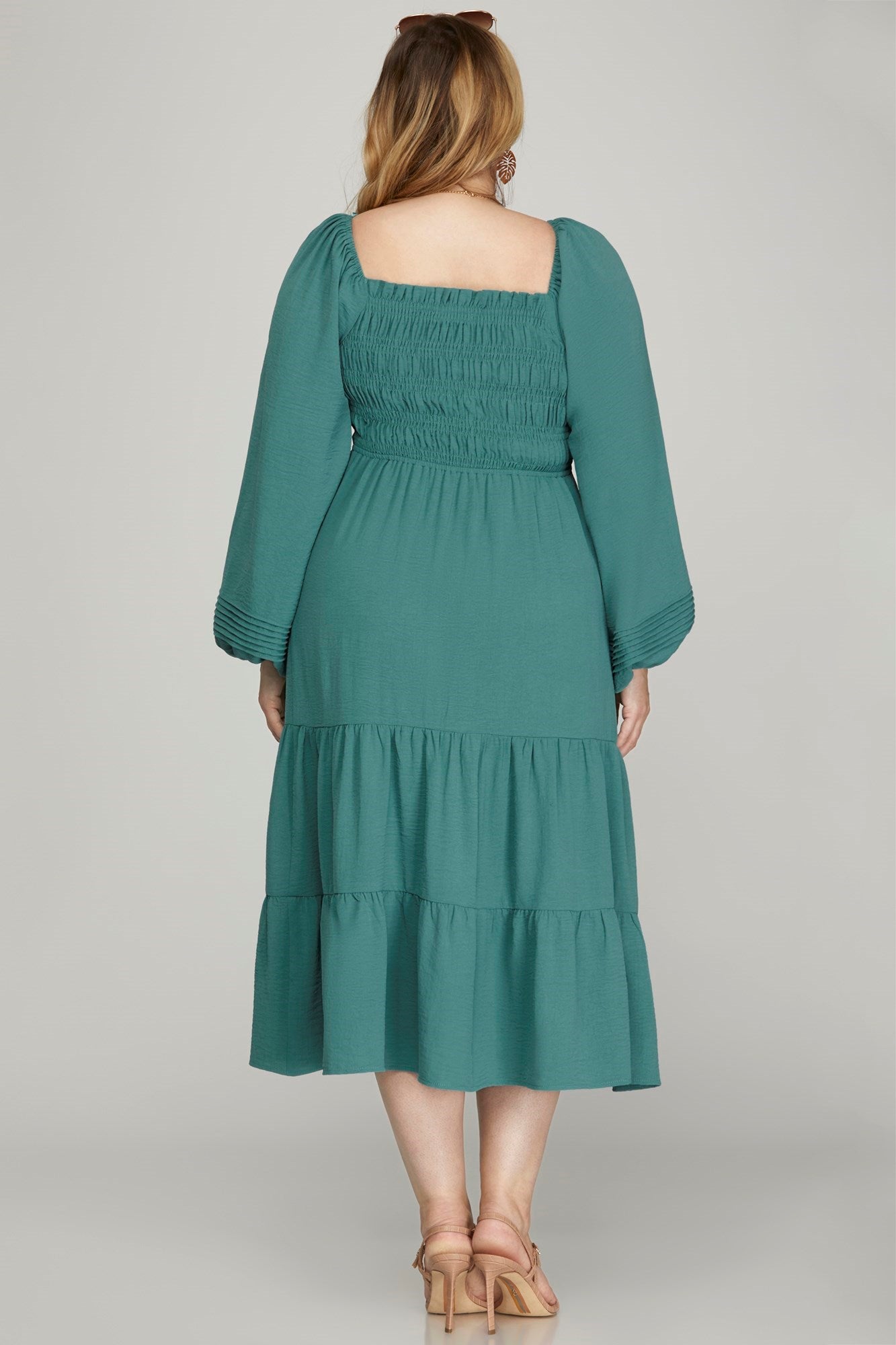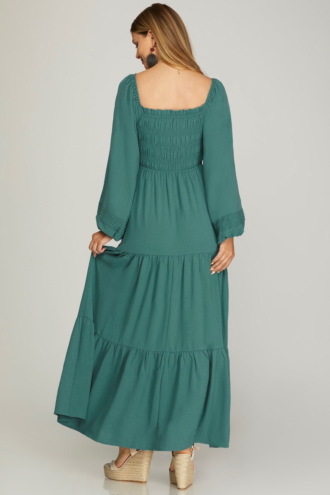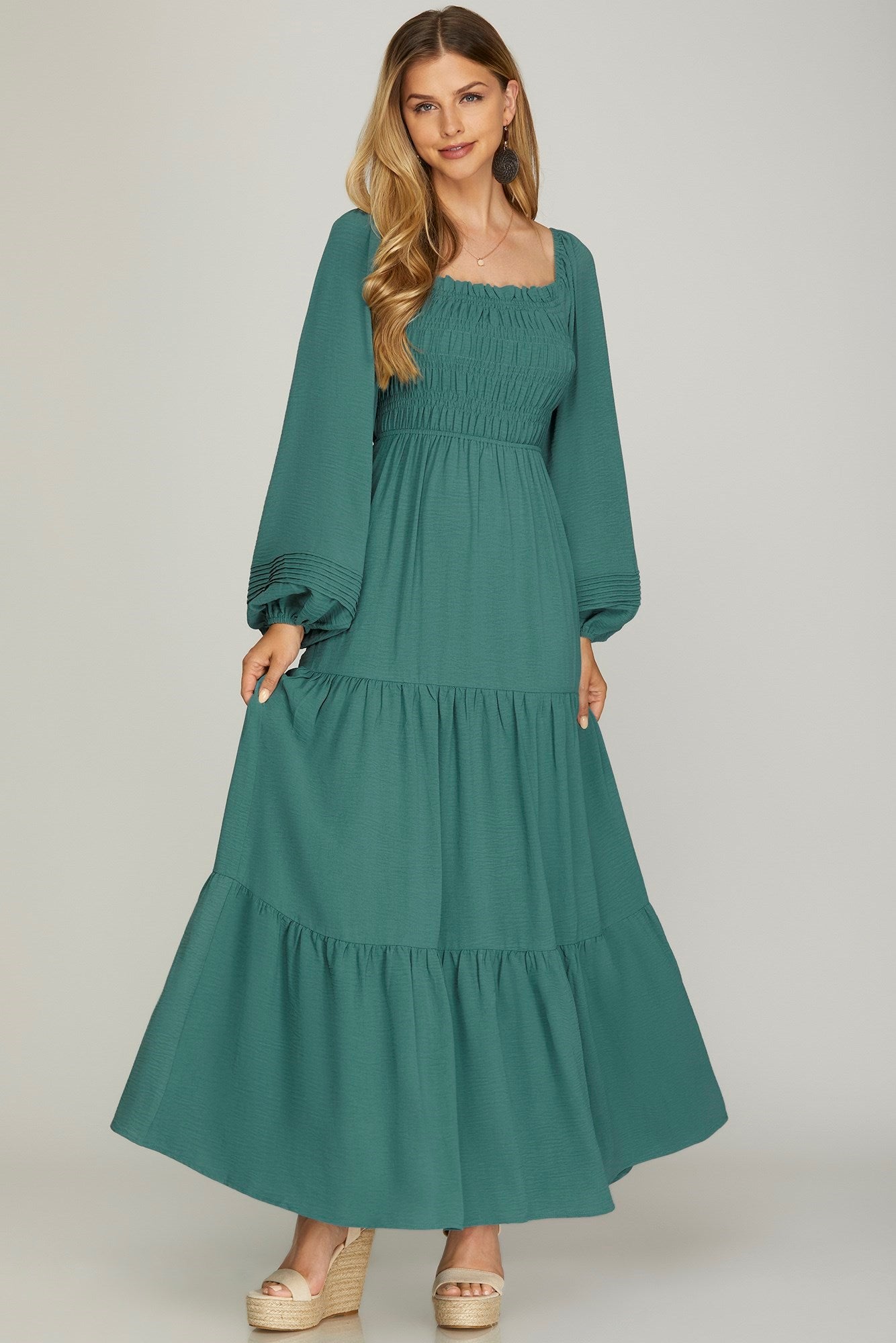 PUFF LONG SLEEVE SMOCKED TIERED MAXI DRESSMODEL IS 5'8" AND MODEL IS WEARING SIZE SMALL