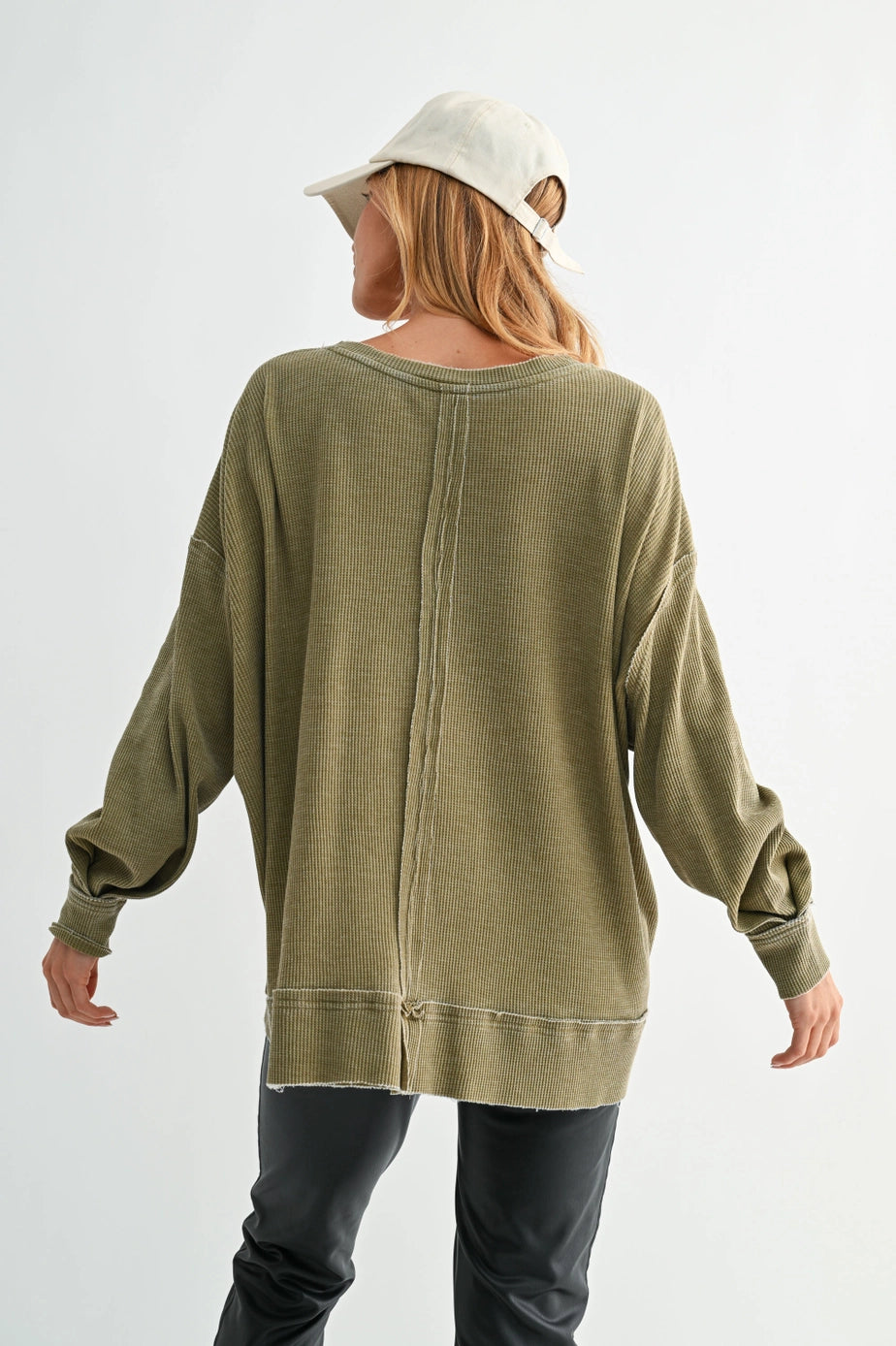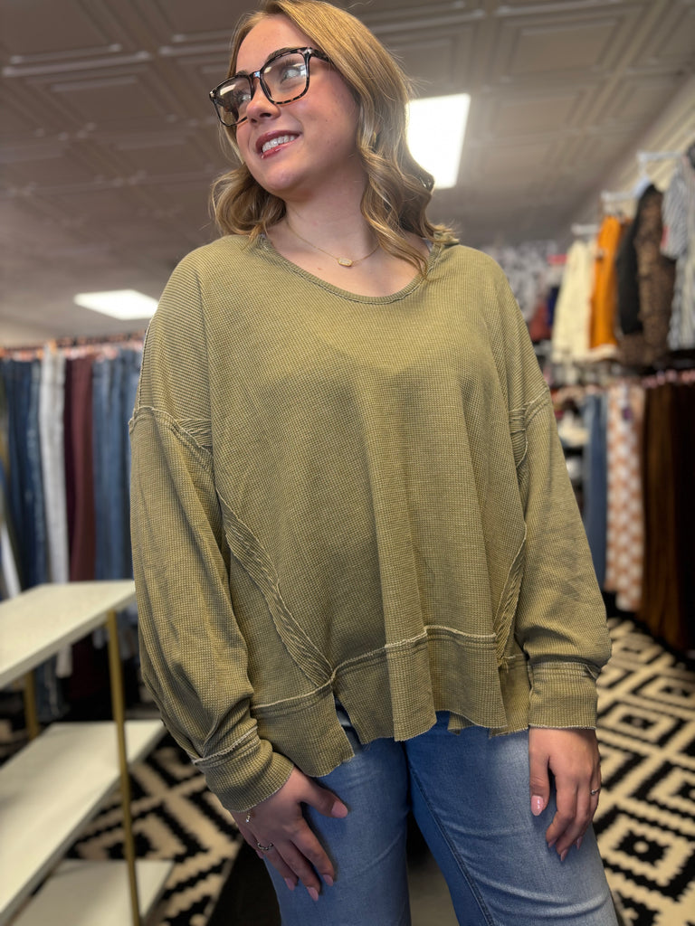 Embrace effortless style with our Oversized Waffle-Knit Distressed Long Sleeve.