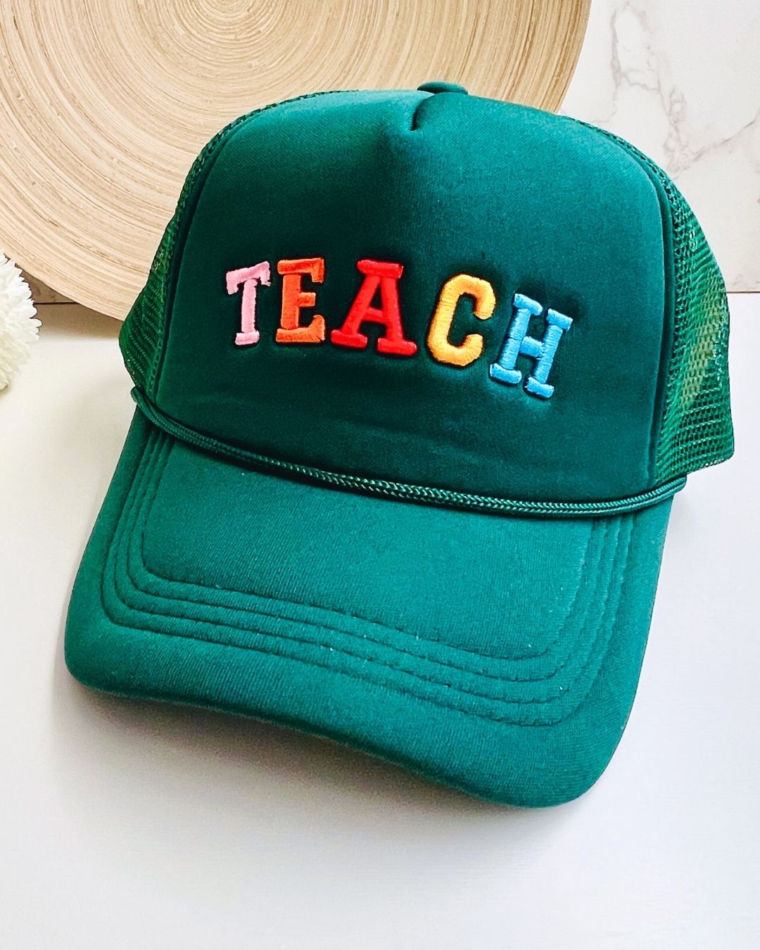Support your favorite teachers! This colorful and cute trucker hat makes a great Teacher Appreciation Gift. The lettering is thick and embroidered.
