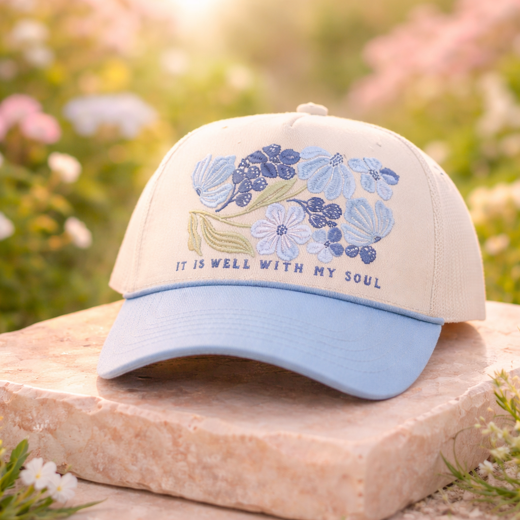 A cotton trucker hat from our Faith Collection displaying beautiful blue flowers replicated from original hand illustrated art with an inspirational sentiment that reads "It Is Well With My Soul." Floral design and inspirational sentiment is embroidered for added texture with a coordinating blue color cording accent. Our It Is Well With My Soul trucker hat is one size fits most with an adjustable snap closure to create the perfect fit and full mesh back for comfort and breathability in hot weather. Hand wash only. An inspirational accessory perfect for gifting and everyday self expression.