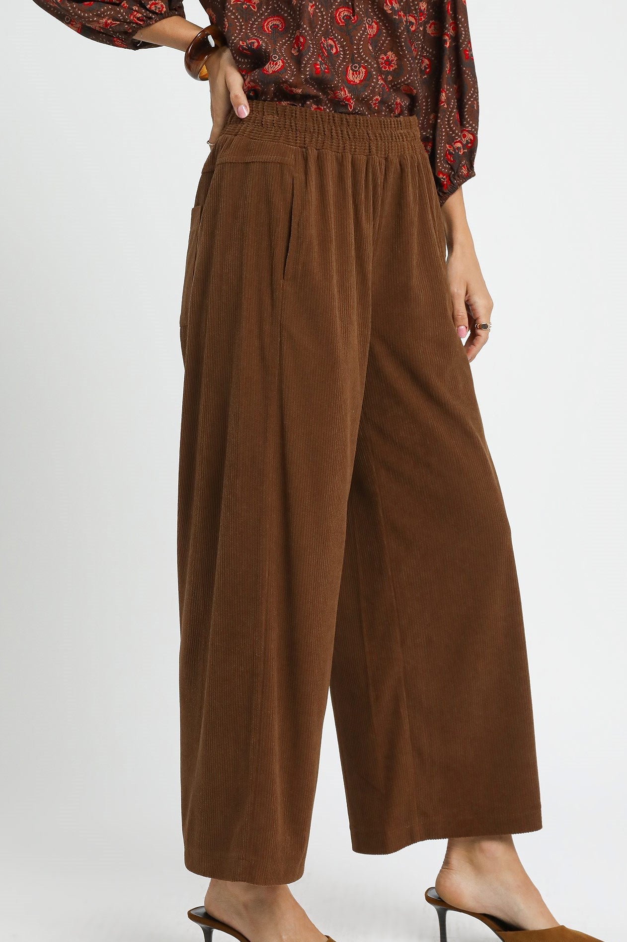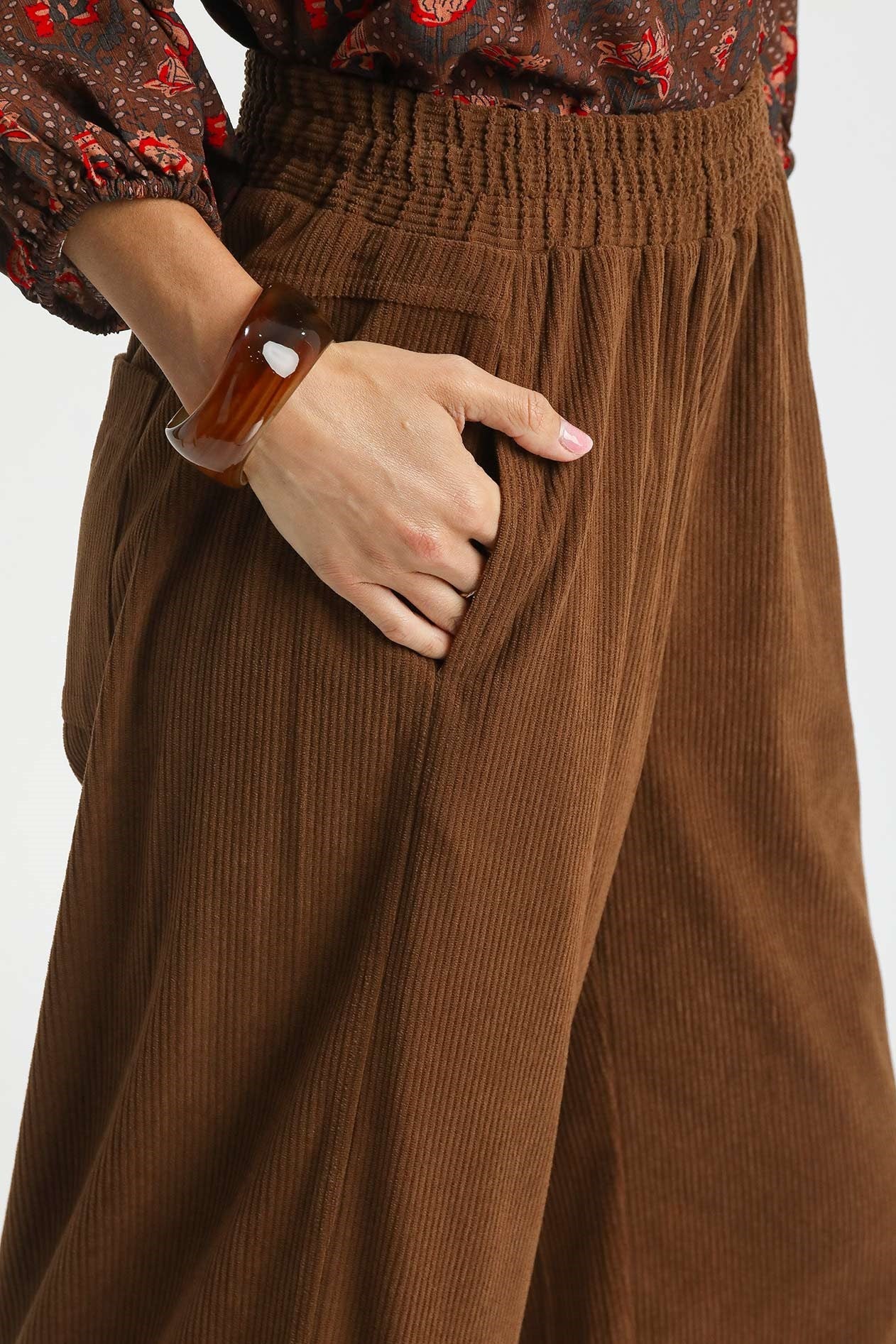 These wide-leg corduroy pants feature a soft, textured fabric and a wide smocked elastic waistband for comfortable wear. Designed with a relaxed silhouette and practical side pockets, they offer effortless style without lining. The model, standing at 5'9", is shown wearing a size small. Crafted from 95% polyester and 5% spandex, these pants combine durability with slight stretch. Measurements are approximate.