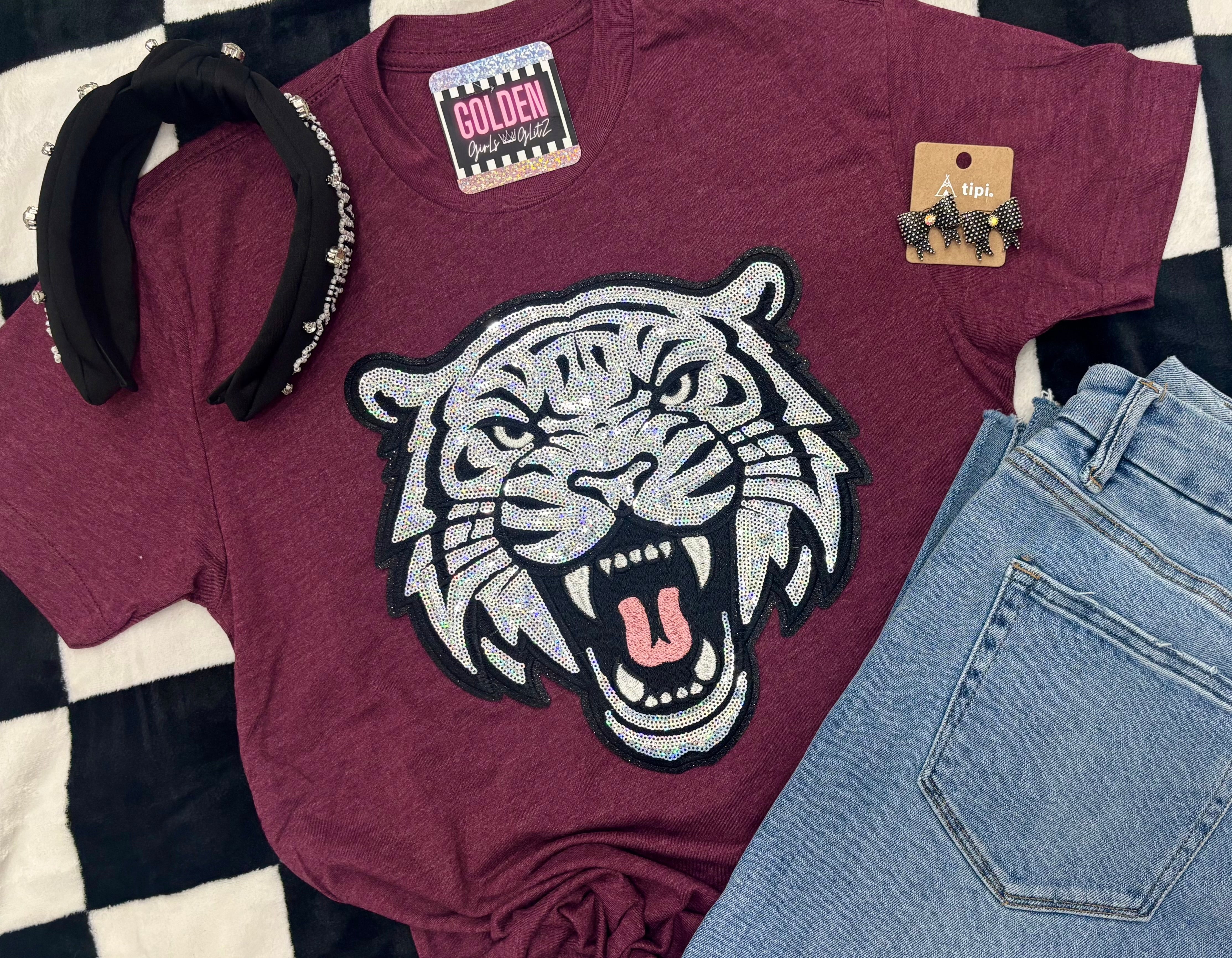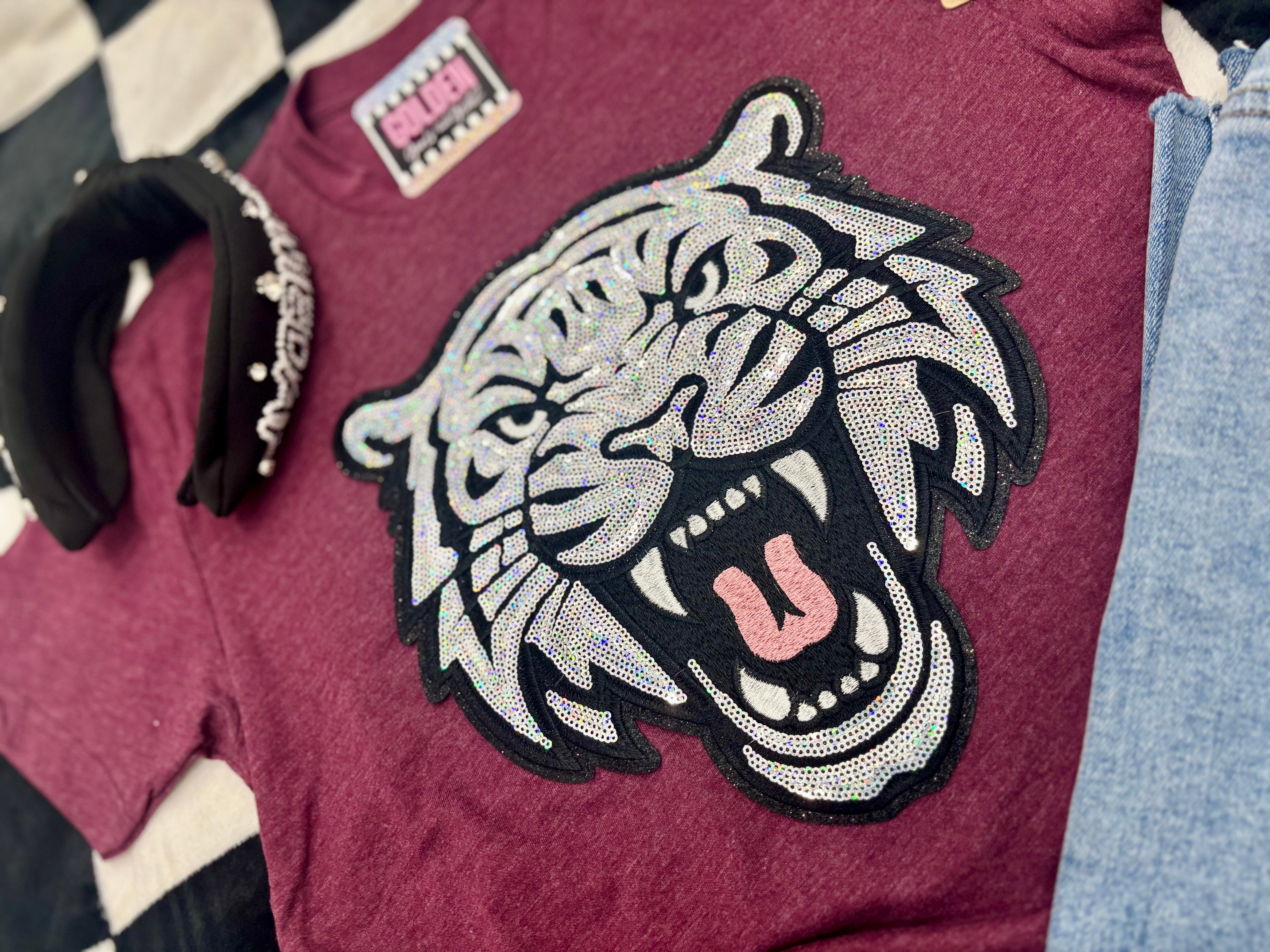 Show your pride with the Tigers Metallic Patch Tee! This stunning t-shirt features a bold tiger design and eye-catching sequins, making it the perfect addition to any fan's wardrobe. Represent your team in style and stand out from the crowd.