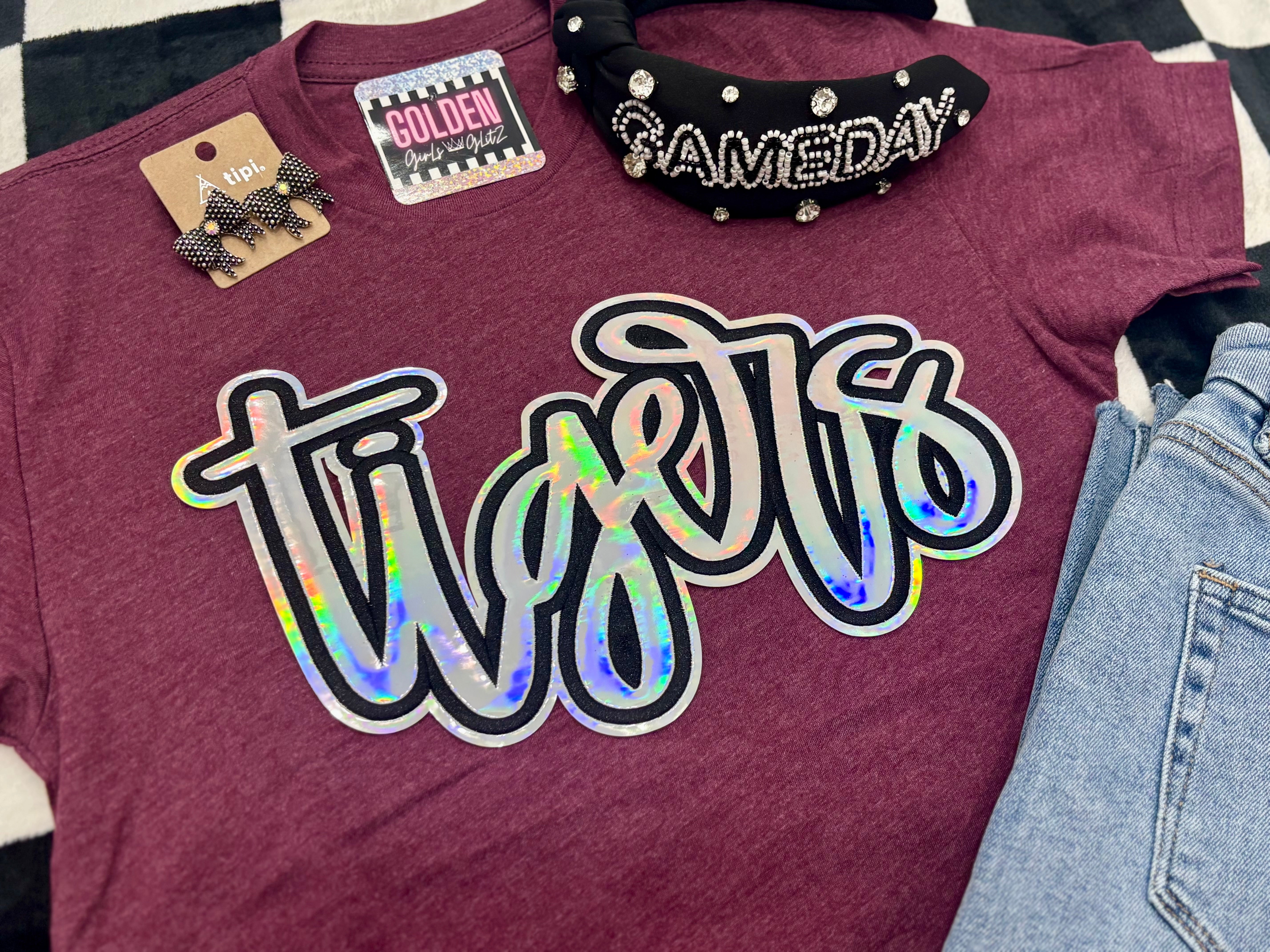 Show your pride with the Tigers Metallic Patch Tee! This stunning t-shirt features a bold tiger design and eye-catching sequins, making it the perfect addition to any fan's wardrobe. Represent your team in style and stand out from the crowd.