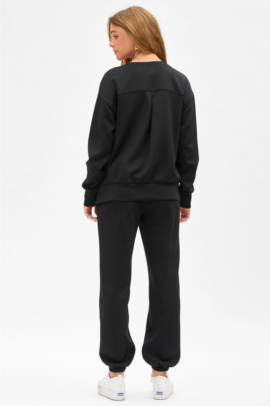 Meet your new favorite not-so-basic set from our Travel Collection! This chic pullover and matching jogger pants combo is designed for effortless style and all-day comfort. The pullover features a classic round neckline, banded sleeves and hem, elevated with a stunning pleated back detail and subtle X-stitching on the front. The jogger pants are complete with an elastic waistband and drawstring for an easy, flattering fit. Wrinkle-free and travel-ready, this set is perfect for a polished airport look or packing for your next getaway. Just throw it on and step out in style—no fuss, no wrinkles, just easy!