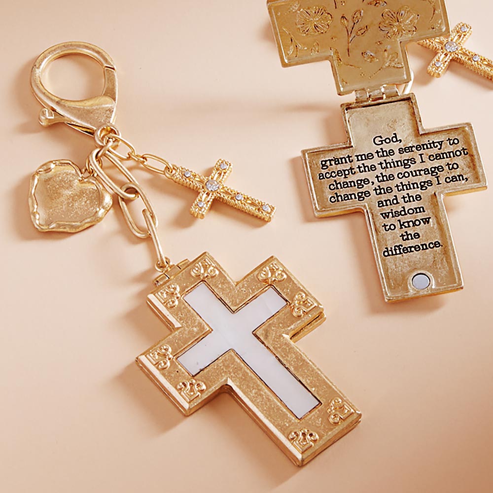 • Elegant cross keychain featuring engraved inspirational message and charm accents. Includes the Serenity Prayer inside a hinged design. Ideal for gifting or daily encouragement on bags, keys, or backpacks.