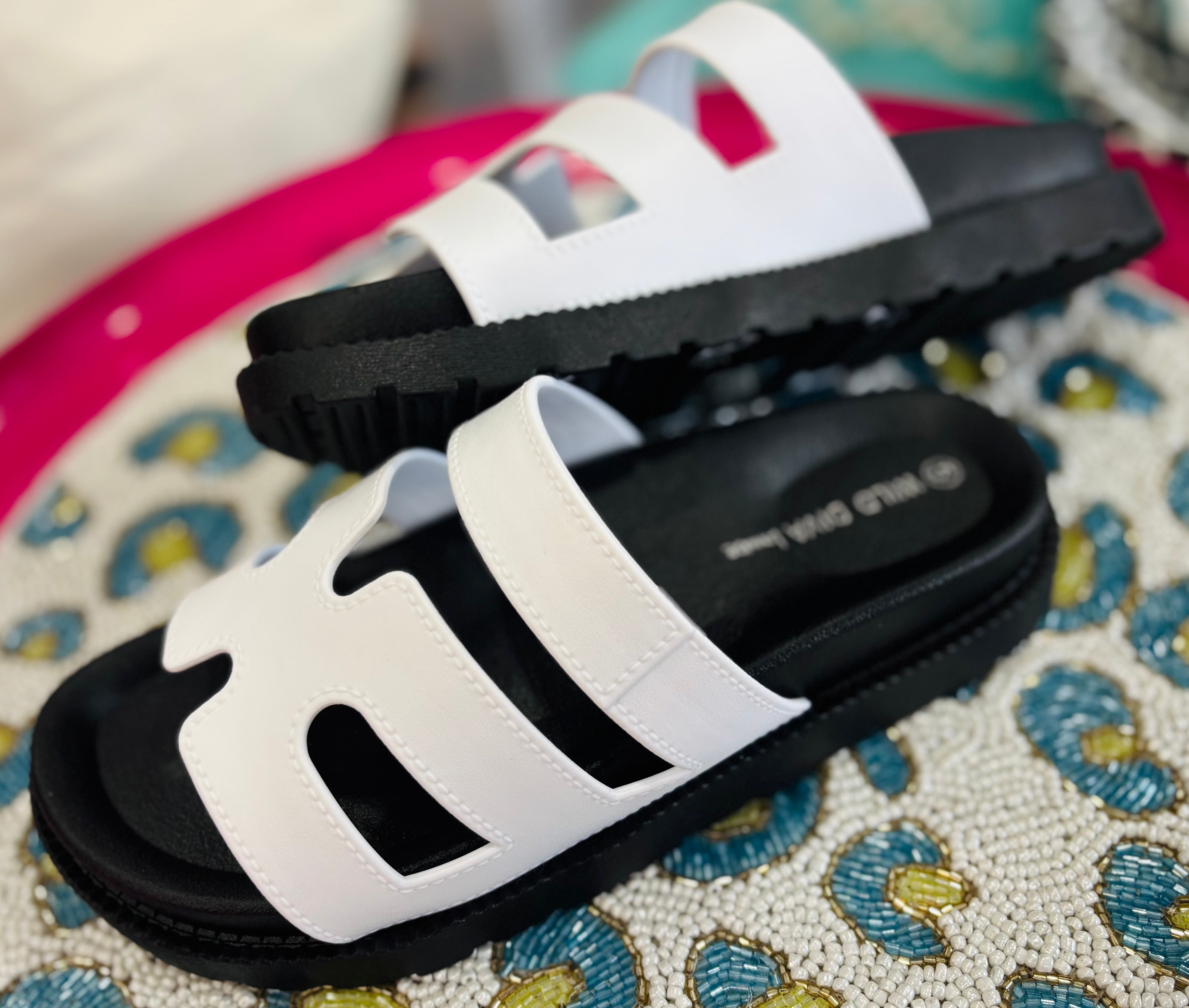 These white and black sandals offer a sophisticated and versatile style. Made with quality materials, they provide a comfortable fit for all-day wear. The contrasting colors add a modern touch, making them perfect for any outfit. Step into elegance and comfort with these sandals.