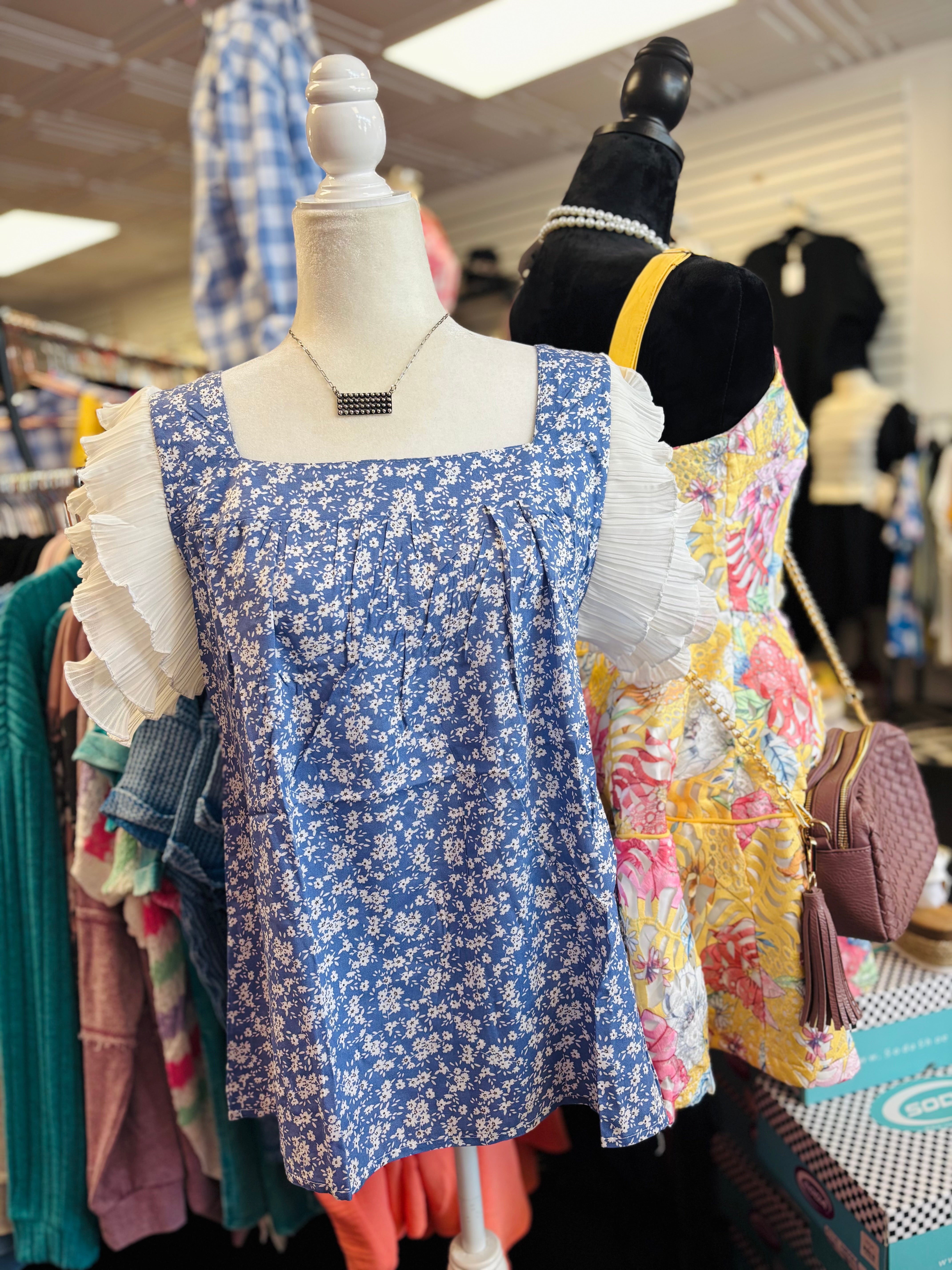 Blue Floral Ruffled Sleeve Top - is backordered and will ship as soon as it is back in stock.