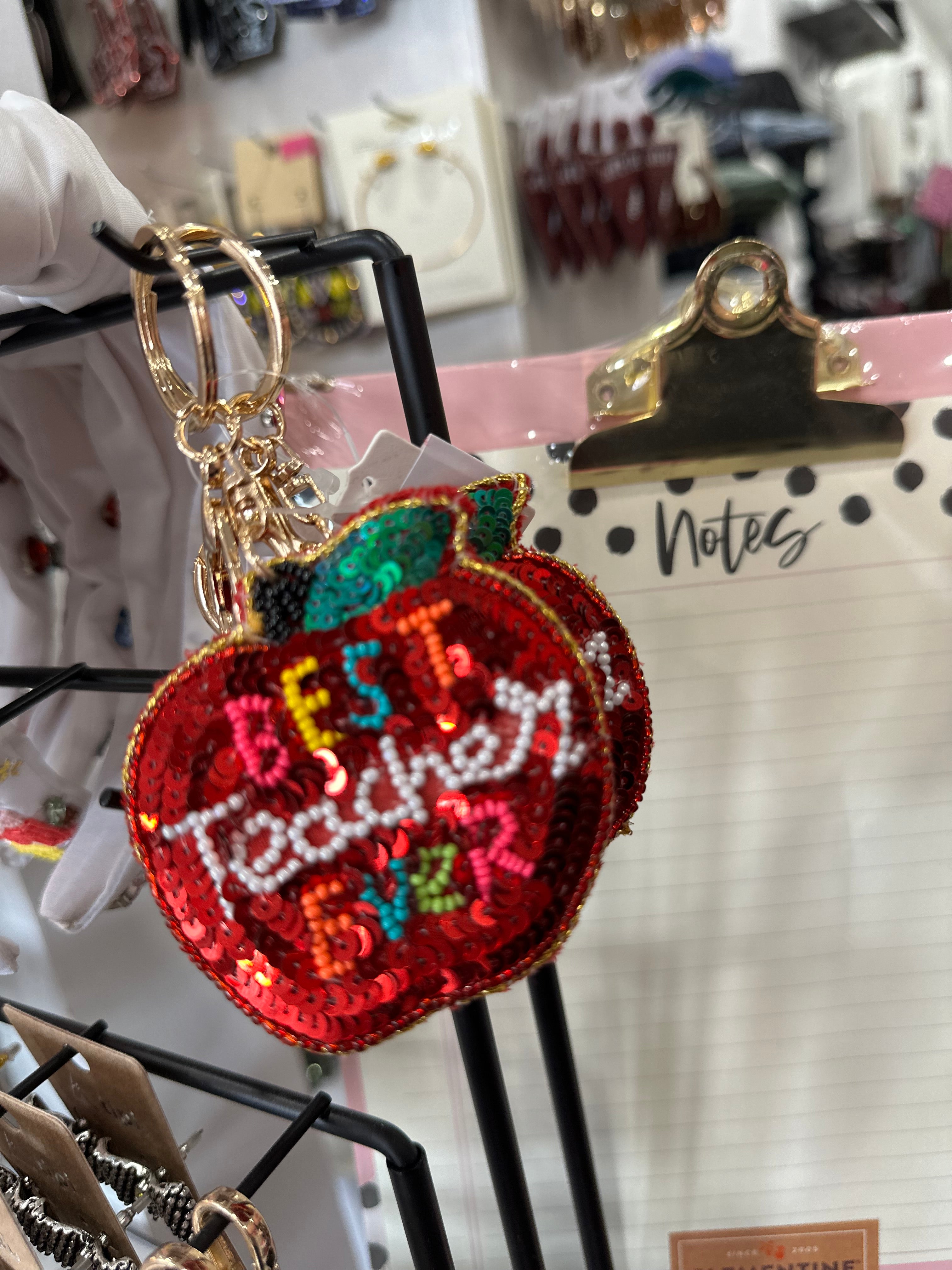 This Best Teacher Embroidered Apple Keychain is a charming and unique accessory for any educator. Handmade with intricate beaded embroidery, this keychain is a great way to show appreciation for a special teacher.