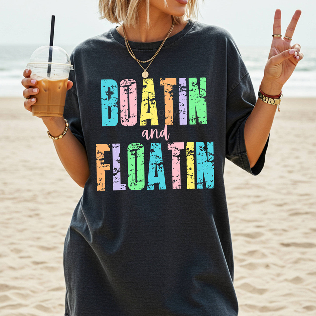 Boat hair, don’t care! The “Boatin and Floatin” graphic is all about laid-back days, cold drinks, and the open water. With bold block lettering in bright, distressed rainbow tones, this design is giving lake weekends, girls' trips, and dockside chillin’. Whether you're cruising on the pontoon or drifting with a drink in hand, this one's for your summer crew who lives for sun and splash.