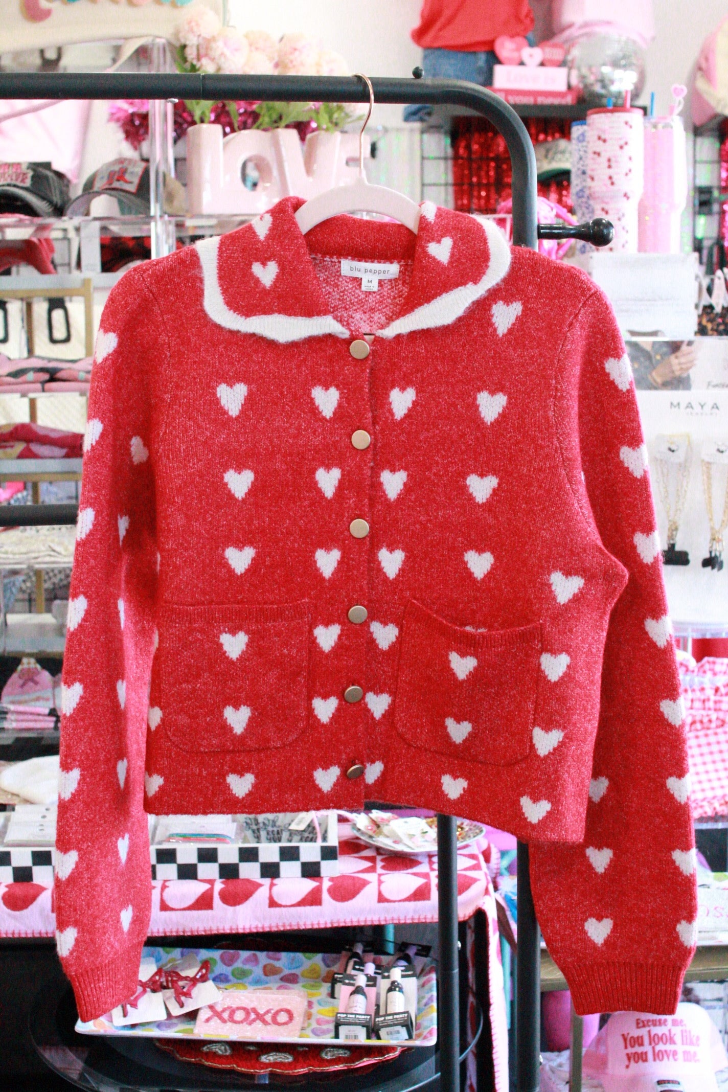 The Heart Scalloped Buttoned Sweater combines a classic button-up design with a unique scalloped edge, contributing to both aesthetic appeal and functional versatility. The heart motif offers a playful yet sophisticated touch, making this sweater suitable for various occasions. Its fabric composition ensures comfort while maintaining structural integrity.