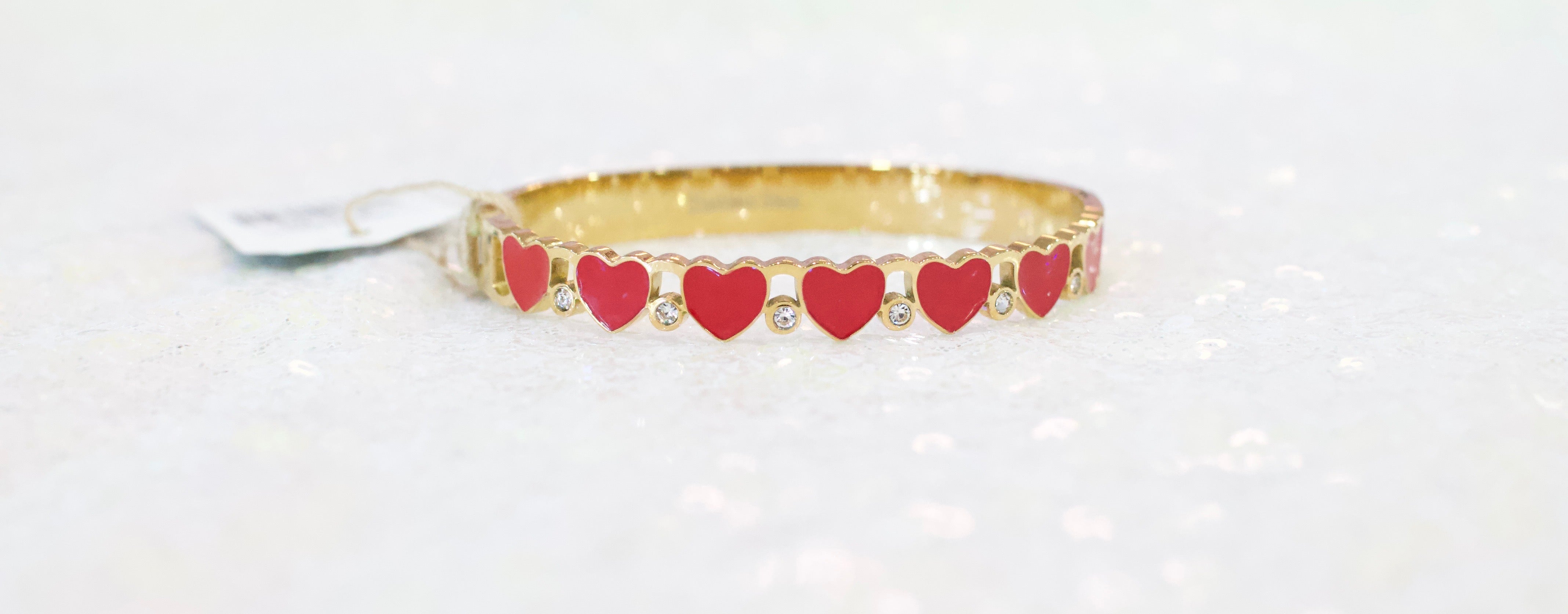 • Stylish hinged bangle bracelet designed with a repeating heart motif and subtle accent detailing for a romantic, modern look. Features an easy open-and-close hinge for a secure, comfortable fit. Ideal for everyday styling, gift assortments, and boutique jewelry collections focused on love-inspired designs.