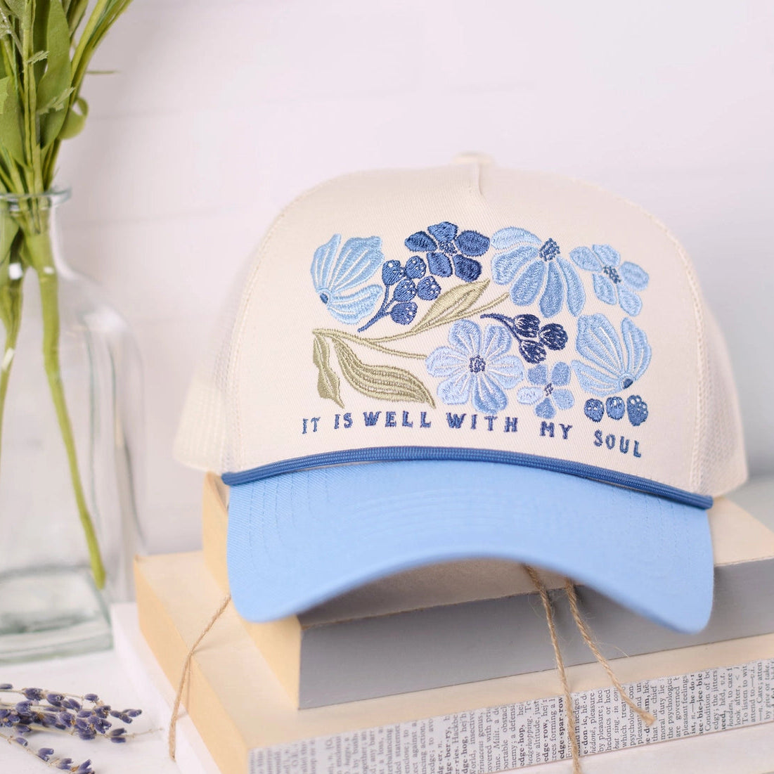 A cotton trucker hat from our Faith Collection displaying beautiful blue flowers replicated from original hand illustrated art with an inspirational sentiment that reads "It Is Well With My Soul." Floral design and inspirational sentiment is embroidered for added texture with a coordinating blue color cording accent. Our It Is Well With My Soul trucker hat is one size fits most with an adjustable snap closure to create the perfect fit and full mesh back for comfort and breathability in hot weather. Hand wash only. An inspirational accessory perfect for gifting and everyday self expression.