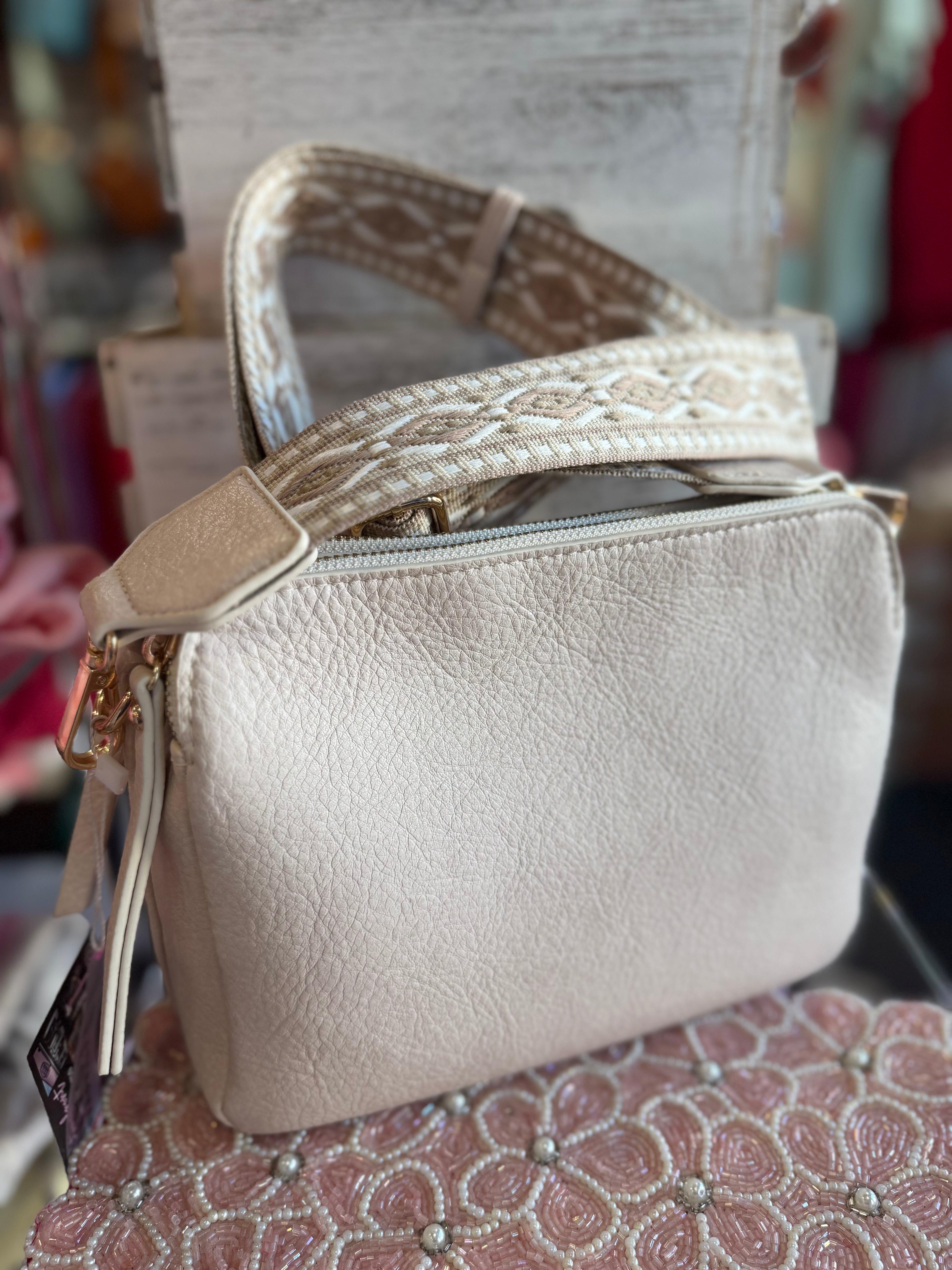 Carry all your belongings in style with the Mila 3 Compartment Crossbody Bag with Guitar Strap. T