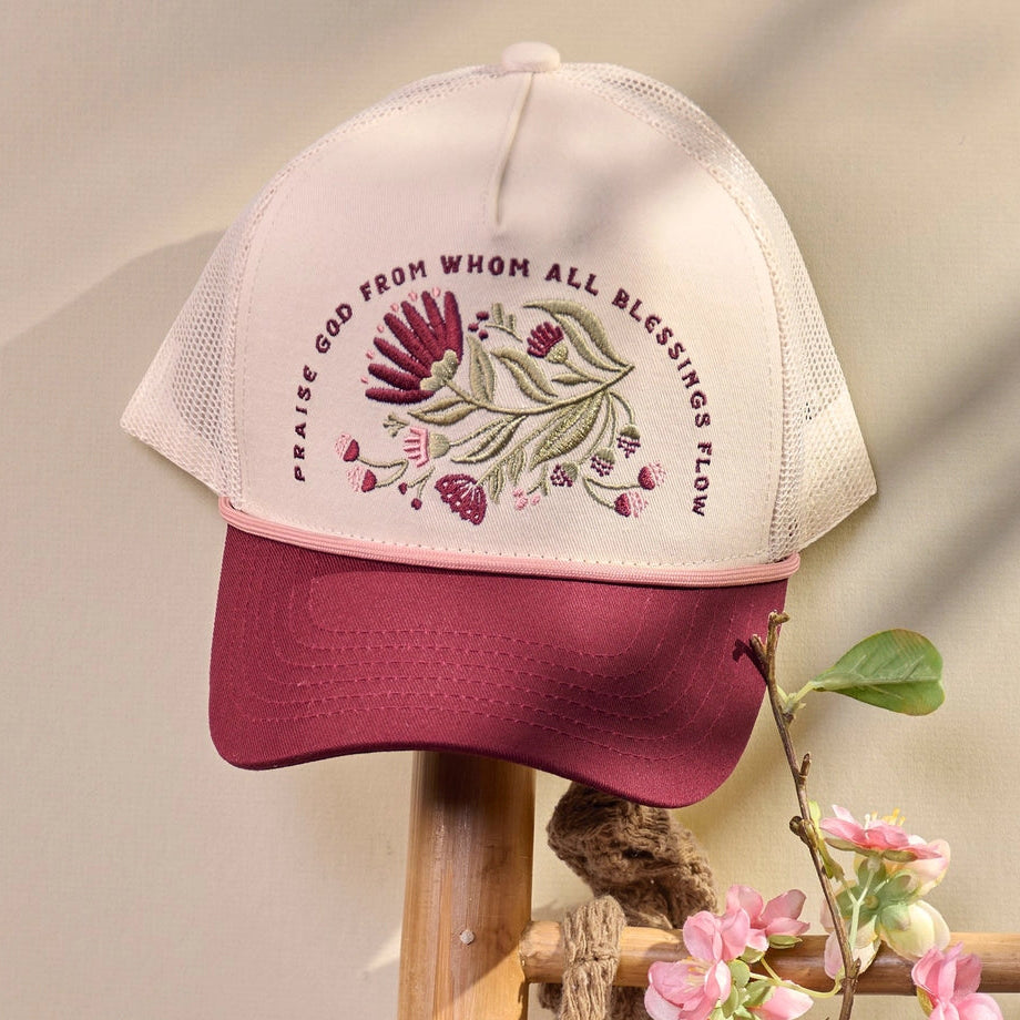 A cotton trucker hat from our Faith Collection displaying beautiful red flowers replicated from original hand illustrated art with a faith inspired sentiment that reads "Praise God From Whom All Blessings Flow." Floral design and faith sentiment is embroidered for added texture with a coordinating pink color cording accent. Our Praise God trucker hat is one size fits most with an adjustable snap closure to create the perfect fit and full mesh back for comfort and breathability in hot weather. Hand wash only. A faith-themed accessory perfect for gifting and everyday self expression.