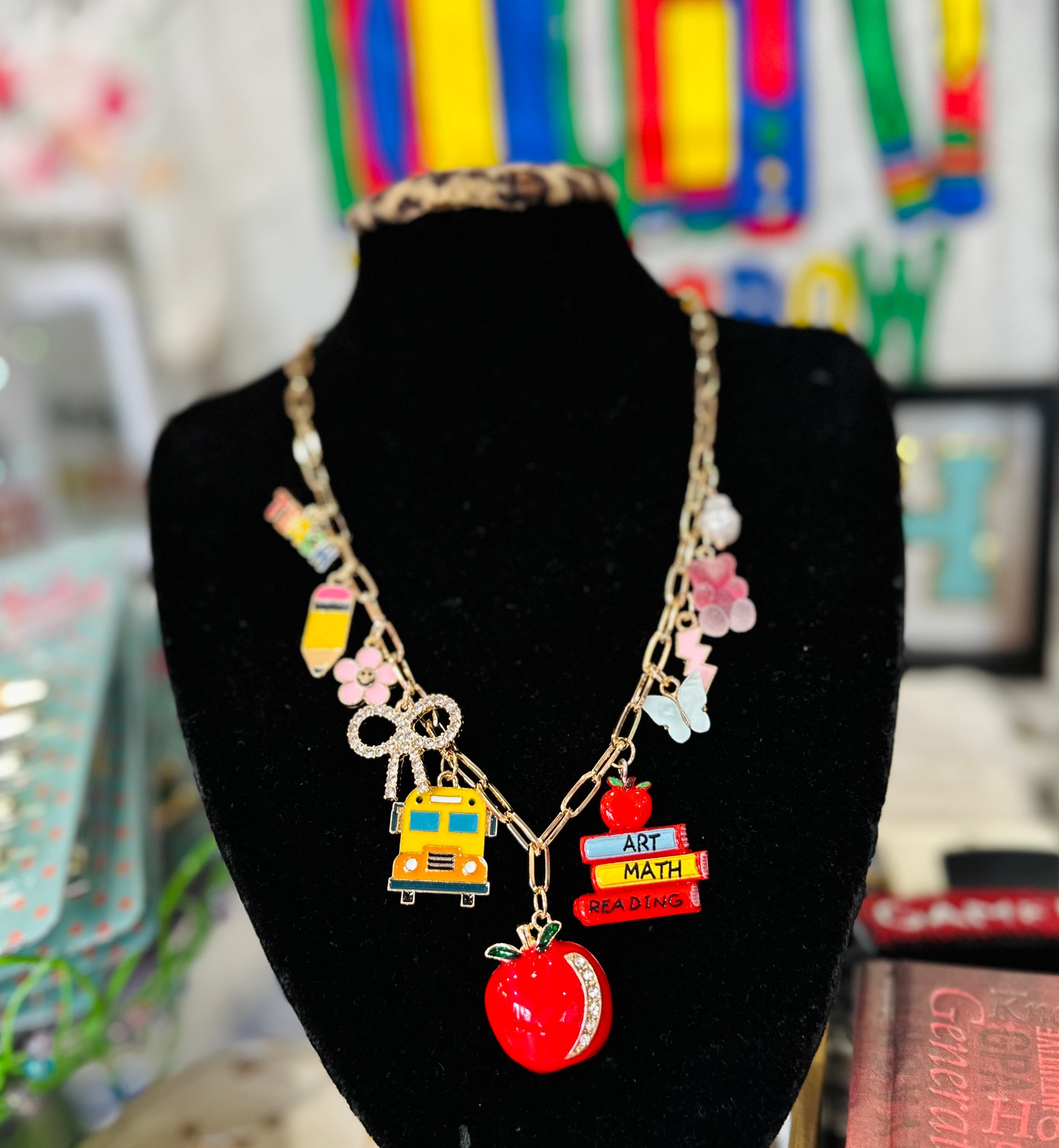 This school-themed necklace features multiple charms adorned with jewels, making it a stunning addition to any outfit. Show off your school spirit with this elegant piece and add a touch of sophistication to your ensemble.