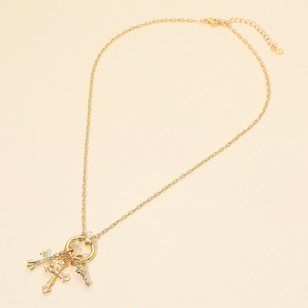 This stunning Triple Cross Necklace features a trio of beautiful and intricate cross charms on a delicate necklace. Express your faith and elevate any outfit with this timeless piece. Handcrafted with care and precision, this necklace is a must-have for any jewelry collection.